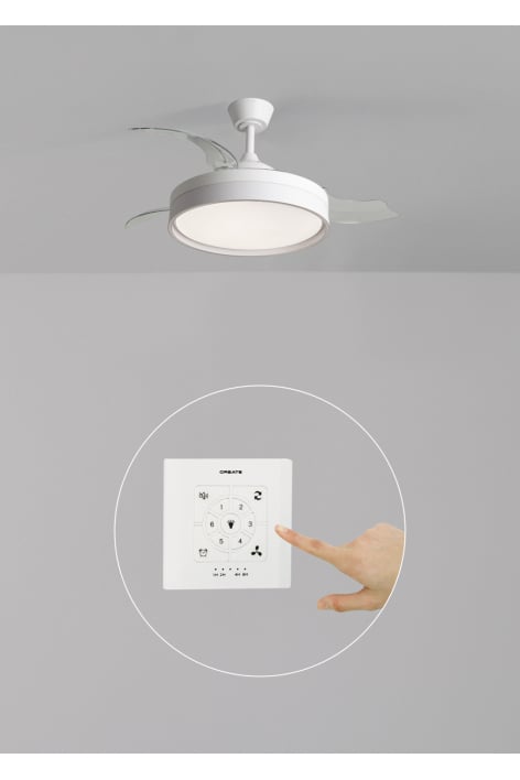 Silent ceiling fan with a 40 W DC Brushless motor, ensuring longer lifespan. It features a summer/winter function and 6 speeds. Its blades are retractable and it includes an integrated LED light with 3 color temperatures and a programmable timer of up to 4 hours. You can also choose the WiFi option to control it from your mobile phone using the Create app.