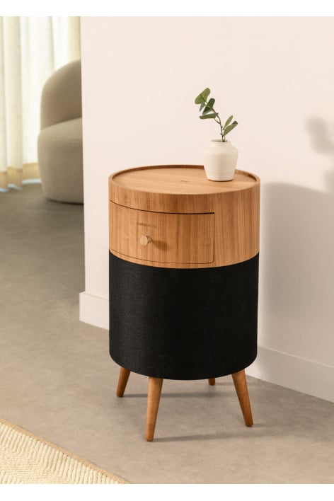 Its function is twofold: speaker and side table, as it has a storage drawer. You can also use it to charge your mobile device.