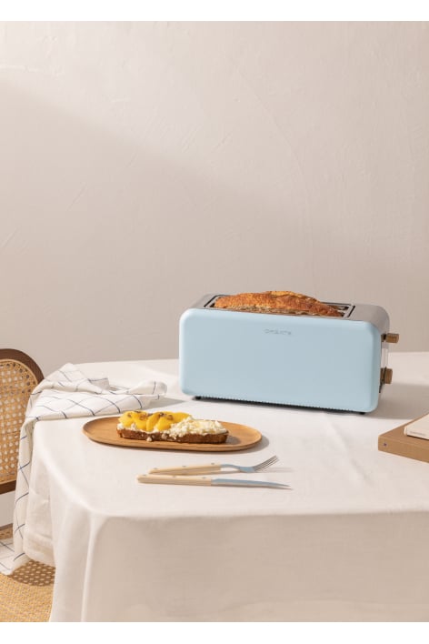 Retro-style bread toast with two wide slots. It's practical, safe and easy to use. It stands out for its retro design that adds an elegant touch to any kitchen. In addition, it has 6 toasting levels and non-slip feet.