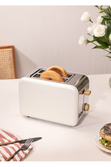 Retro-style bread toast with two wide slots. It's practical, safe and easy to use. It stands out for its retro design that adds an elegant touch to any kitchen. In addition, it has 6 toasting levels and non-slip feet.